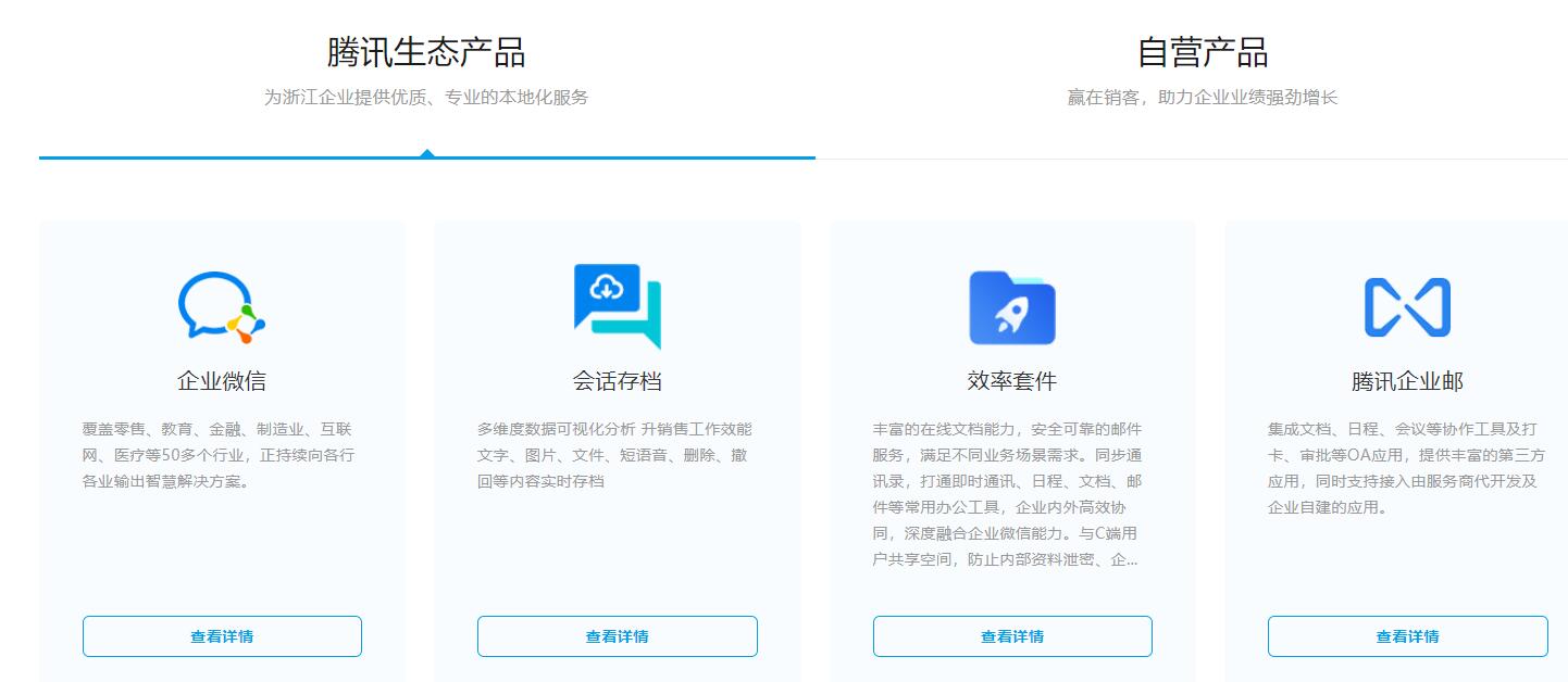 模塊化設(shè)計:將產(chǎn)品分為兩大類(騰訊生態(tài)產(chǎn)品和自主產(chǎn)品),每個產(chǎn)品模塊都包含圖標(biāo)、標(biāo)題和簡要描述,用戶可以快速了解每個產(chǎn)品的主要功能和優(yōu)勢。
