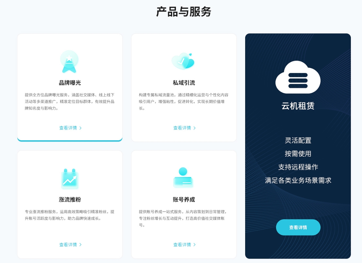 模塊化展示服務(wù)內(nèi)容,采用卡片式設(shè)計,主色調(diào)為淺藍(lán)和白色,結(jié)合簡單圖標(biāo),淺藍(lán)色突出科技屬性,同時圖文結(jié)合增強信息傳達(dá)效率。