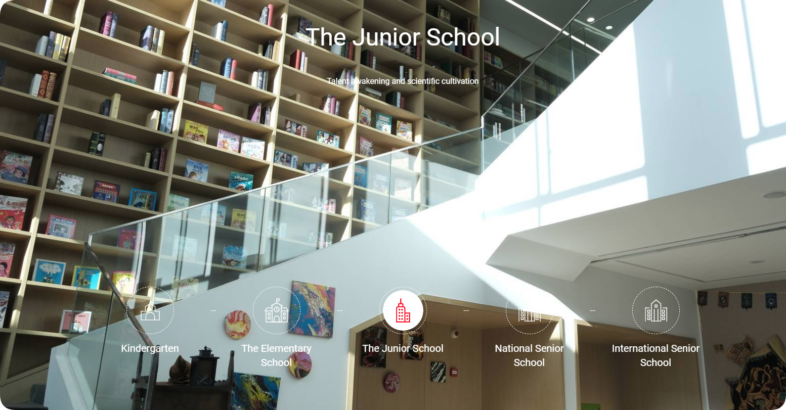 • 學(xué)部展示(幼兒園、小學(xué)部、初中部、國(guó)際中心):采用橫向排版+圖標(biāo)導(dǎo)航,增強(qiáng)可讀性和交互體驗(yàn)。