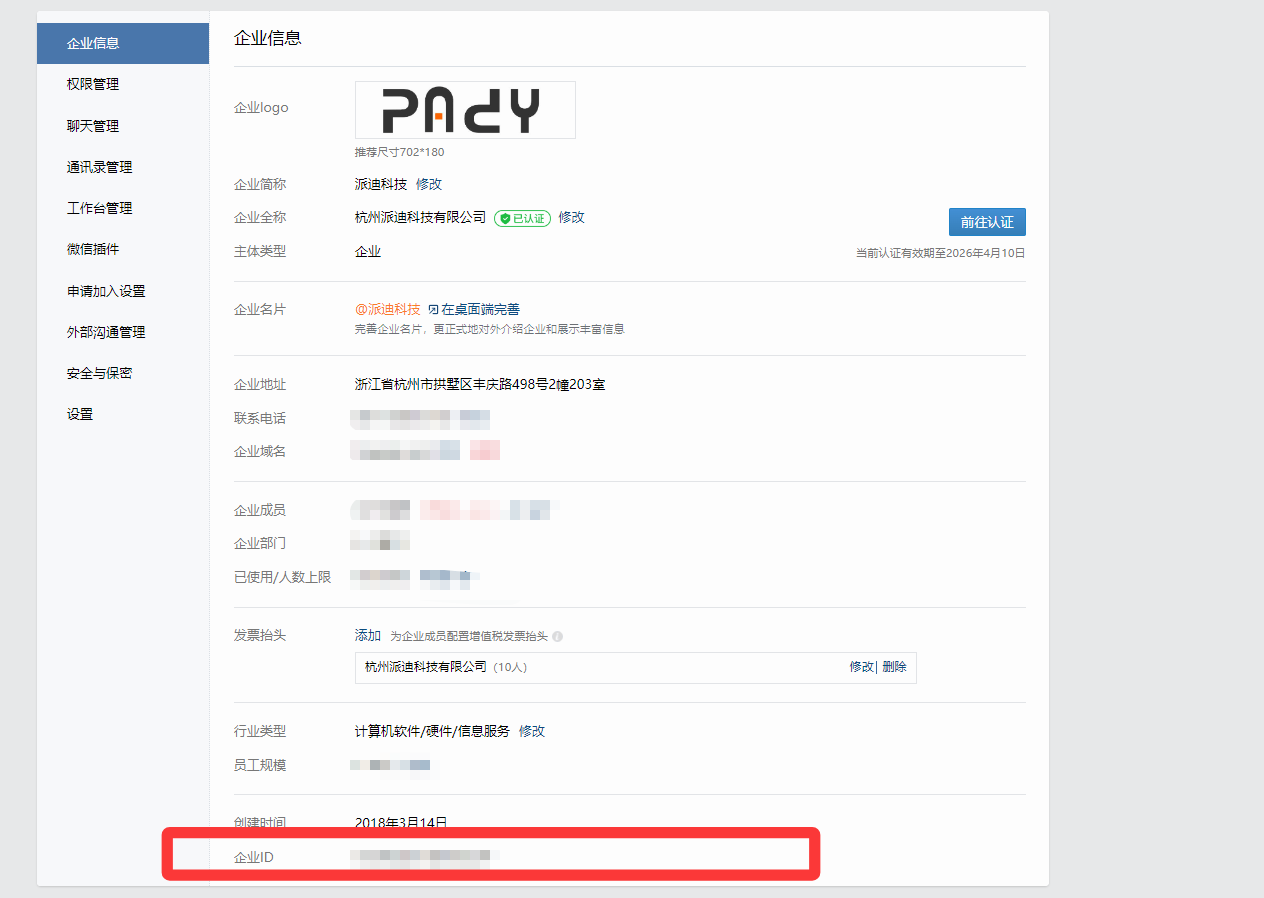 依然在企業(yè)微信的管理后臺(tái),查看【企業(yè)信息】