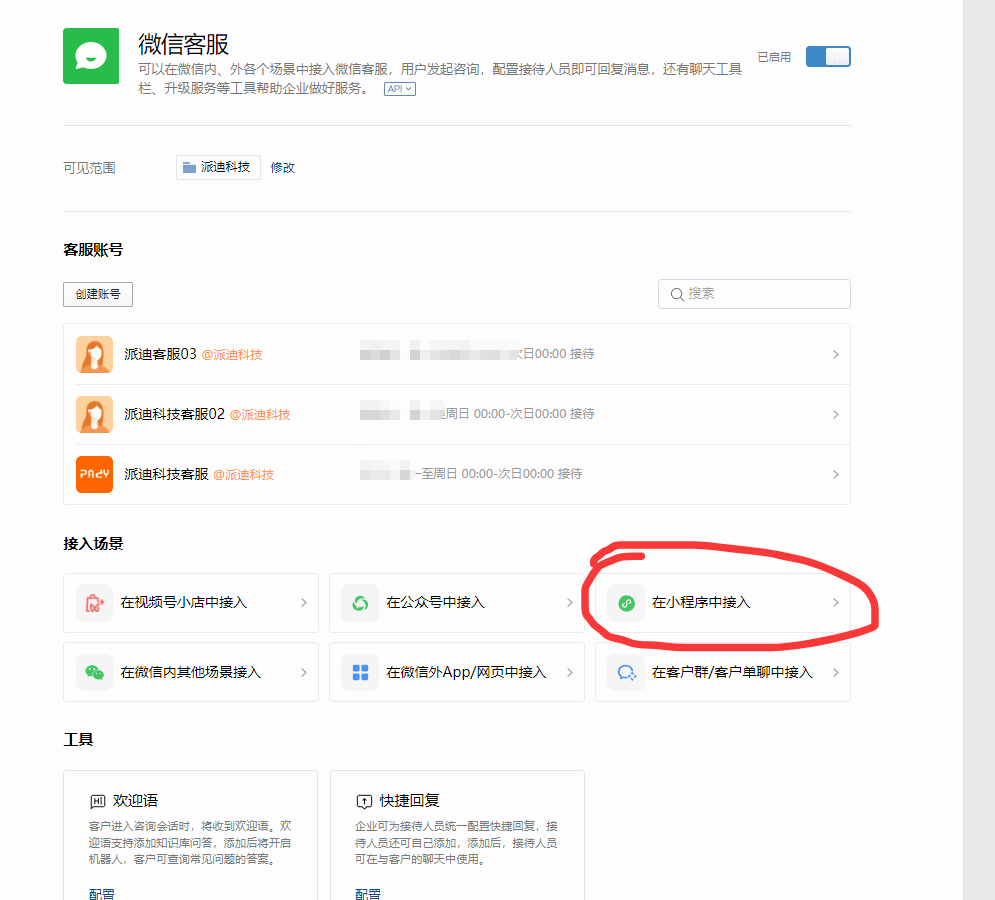 如何獲取獲取客服鏈接接上面的頁(yè)面,依然在微信客服的設(shè)置頁(yè)面,找到下面的【在以下場(chǎng)景中接入】,點(diǎn)擊