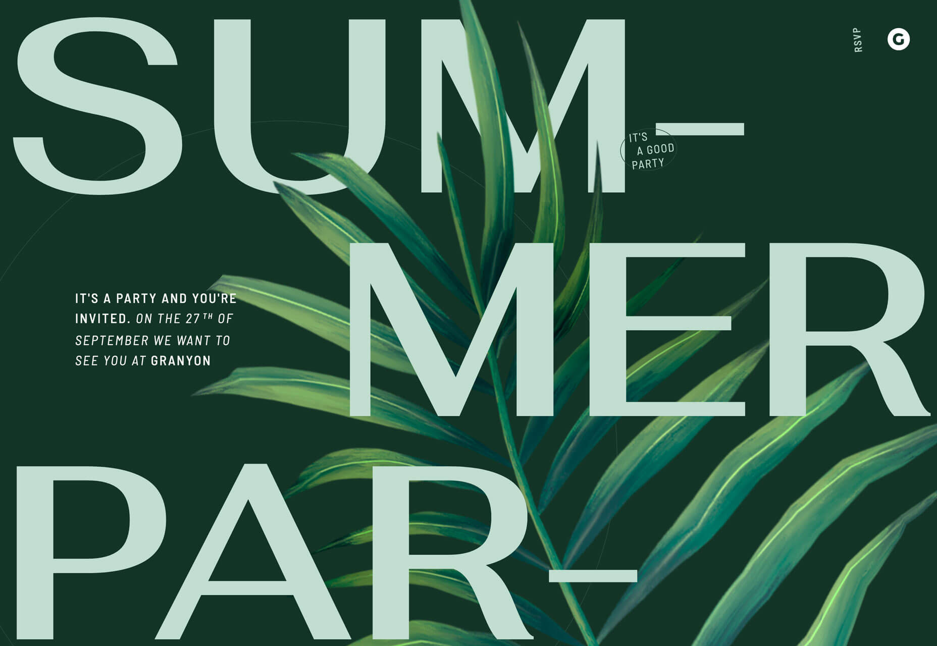Granyon Party在分層設(shè)計(背景,文本,動畫插圖)中使用了超大尺寸的文本,其中的文字被連字并在設(shè)計元素的后面。盡管模糊的文本相當(dāng)容易閱讀,但加上連字符和單調(diào)調(diào)色板會使其變得有些棘手。