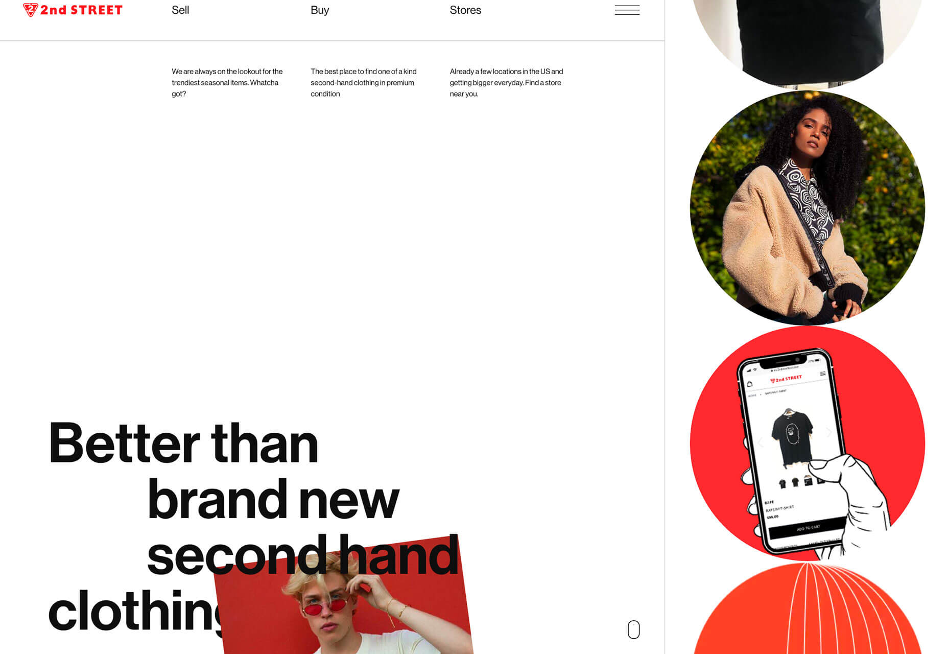 第二街將右邊界下方的大球體用作輔助導(dǎo)航。中間的圓圈具有鏈接和懸停動畫以幫助發(fā)出此動作信號。底部的圓圈是一種運(yùn)動的裝飾,有助于吸引眼球并鼓勵用戶向該方向移動鼠標(biāo),從而激活其他圓形按鈕。