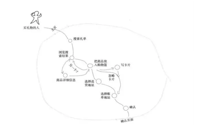 比如,要建立一個(gè)小型電子商務(wù)網(wǎng)站的用戶路徑草圖,可以有這樣一個(gè)場景故事:買禮物的人瀏覽主頁,找到適合的禮物,買下禮物,寫下一張賀卡,寫上朋友的信息,付款。