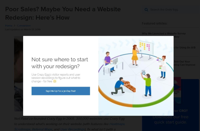 然后,有些人甚至不包含“否”按鈕或“退出”按鈕。我曾經(jīng)在Google Play音樂上遇到過這種情況,除非我簽署了他們的家庭計(jì)劃或刷新頁面,否則有時(shí)候我聽不到我的音樂。我無法獲得該屏幕截圖,因此這是CrazyEgg進(jìn)行的類似操作之一: