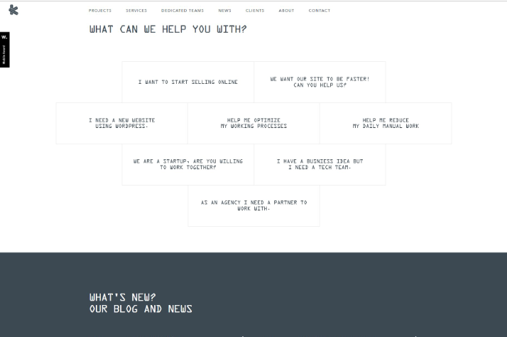 由于許多原因,我在2019年5月版的月度投資組合展示中推薦了Web開發(fā)機(jī)構(gòu)Kutia,但這主要是因?yàn)樗麄儗⒂脩簟罢T騙”到聯(lián)系頁面的方式?;旧?,他們只是問:“我們能為您提供什么幫助?”,并提供許多潛在的答案供人們點(diǎn)擊。