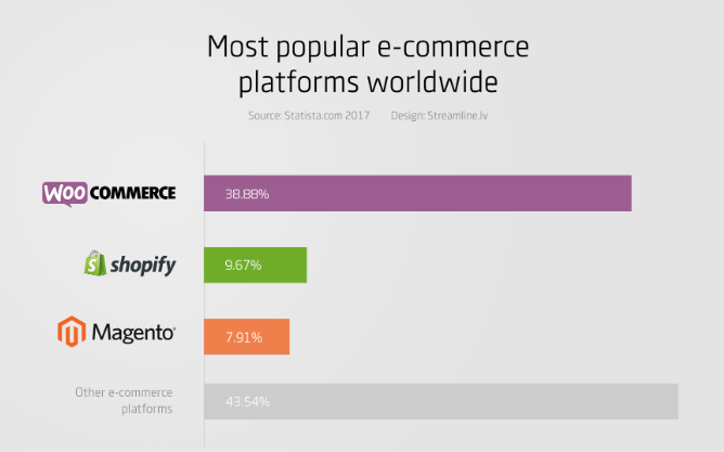如果WordPress是世界上最受歡迎的博客平臺(tái),那么WooCommerce無(wú)疑是最流行的電子商務(wù)解決方案。WooCommerce當(dāng)前在WordPress電子商務(wù)市場(chǎng)上處于領(lǐng)先地位,其受歡迎程度超過了其最接近的競(jìng)爭(zhēng)對(duì)手ShopifyMagento大約四倍。