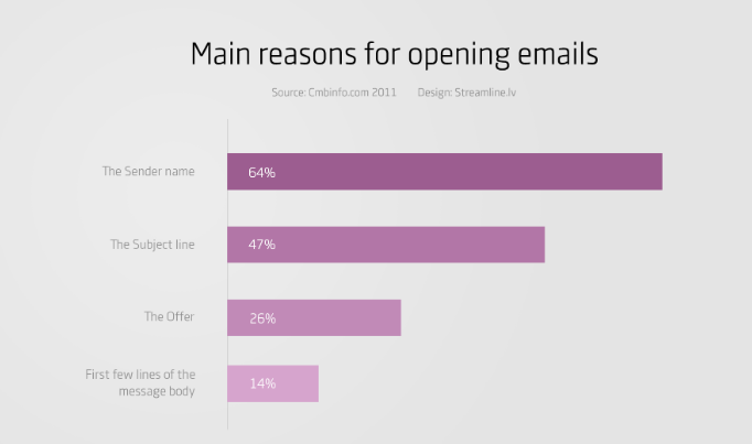 在許多情況下,主題和發(fā)件人名稱是收件人唯一可見的內(nèi)容。CMB的一項(xiàng)研究表明,所有用戶有64%的決定是基于發(fā)件人的姓名來(lái)打開電子郵件,而47%的用戶是基于主題行。