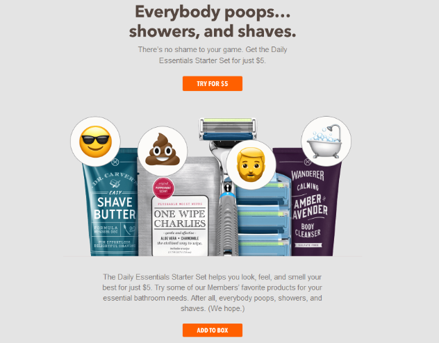 不一樣 試用復(fù)制和內(nèi)容。對(duì)于嚴(yán)格控制身份的公司來(lái)說,這可能很難,但是如果可以的話,請(qǐng)這樣做。與其他所有人不同-例外的廣告商會(huì)吸引注意力。Dollar Shave Club在這里做得很好-他們不僅擁有精美的副本,而且還充分利用了表情符號(hào)趨勢(shì)。