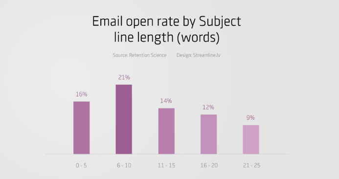 “保留科學(xué)”的另一項(xiàng)研究發(fā)現(xiàn),6-10字長(zhǎng)的主題行產(chǎn)生了最高的電子郵件打開率。這是因?yàn)楹?jiǎn)短的主題太簡(jiǎn)短而無(wú)法傳達(dá)信息,而長(zhǎng)長(zhǎng)的主題卻被截?cái)嗔恕?/span>