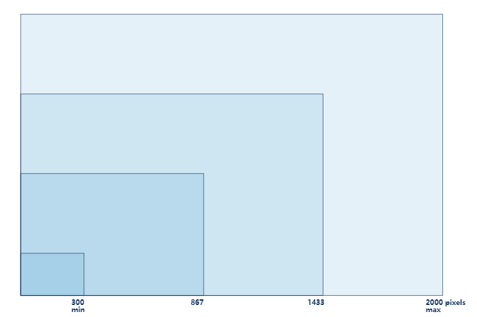 在制作適應(yīng)各種分辨率的圖像時(shí),我們需要生成一系列不同大小的資源。我們需要選擇一個(gè)最大分辨率,一個(gè)最小分辨率,以及介于兩者之間的一些尺寸(這是個(gè)棘手的問題)。可以根據(jù)頁面的布局和有關(guān)設(shè)備的一些合理假設(shè)來確定最大值和最小值。但是,當(dāng)開發(fā)人員開始實(shí)施響應(yīng)式圖像時(shí),還不清楚如何調(diào)整中間圖像的大小。有些人在圖像寬度之間選擇了固定的步長(zhǎng)其他人則選擇了固定數(shù)量的步驟并將其用于每個(gè)范圍:有些人選擇了常見的顯示寬度當(dāng)時(shí),由于我很懶惰并且不喜歡管理許多資源,所以我建議增加一倍