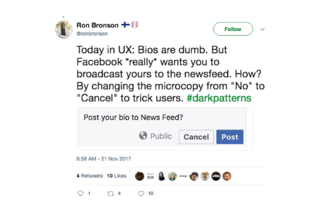 乍一看,似乎沒有什么令人不愉快的。仔細(xì)觀察,很明顯,網(wǎng)站設(shè)計(jì)制作正在推動(dòng)用戶將自己的簡歷分享到新聞提要。這樣做是通過暗示單擊“取消”,您正在取消對(duì)生物所做的更改。實(shí)際上,“取消”表示“否”。同樣,這是一種可以欺騙甚至最注重隱私的做法。對(duì)于其他用戶而言,這是一個(gè)例子,說明如果Facebook意味著用戶將分享更多,更多互動(dòng)并最終對(duì)其廣告收入產(chǎn)生積極影響,它將推動(dòng)極限前進(jìn)多遠(yuǎn)。