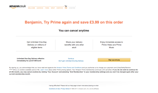首先是來自亞馬遜。它們只是顯示給當(dāng)前不是Amazon Prime會(huì)員的用戶的眾多屏幕之一。主要的號(hào)召性用語是正面和中間。它不是像用戶期望的那樣是“下一步”或“繼續(xù)”按鈕,而是立即向您的卡收取7.99英鎊的費(fèi)用。相反,繼續(xù)選項(xiàng)被隱藏在文本鏈接中的文本鏈接隱藏,該文本鏈接同時(shí)包含頁腳和令人困惑的文本副本。