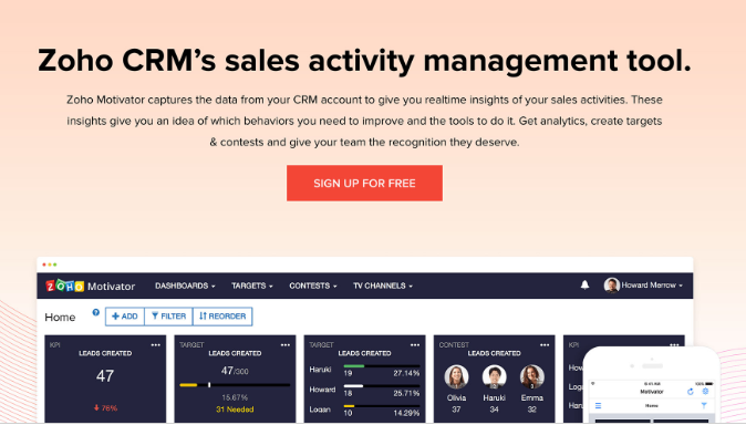 Zoho Motivator是Zoho在線辦公套件中一個活潑的工具。它從Zoho的CRM工具獲取數(shù)據(jù),以衡量公司每個銷售人員的表現(xiàn)。它計(jì)算產(chǎn)生的線索,創(chuàng)造的潛力和完成的銷售。然后,他們在一場友好的比賽中彼此對抗。