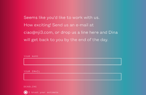 您需要努力回答對站點的所有傳入查詢。為了增強信心,不要僅僅忽略用戶的信息,您應(yīng)該嘗試像NJI3的所有女孩設(shè)計三人組一樣在其聯(lián)系表單上寫肯定的確認(rèn)。他們會讓您從一開始就知道,如果您向他們發(fā)送消息,Dina會在一天結(jié)束之前給您回復(fù)。這迫使用戶冒險嘗試并實際填寫聯(lián)系表格。