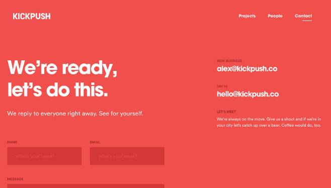 Kickpush通過直接在導(dǎo)航中顯示其聯(lián)系頁面使其易于查找,而不是某些傾向于將其鏈接放在頁腳中的站點。通過將他們的鏈接放置在導(dǎo)航中并使用簡單的“聯(lián)系”一詞,他們消除了尋找如何與他們聯(lián)系的猜測。