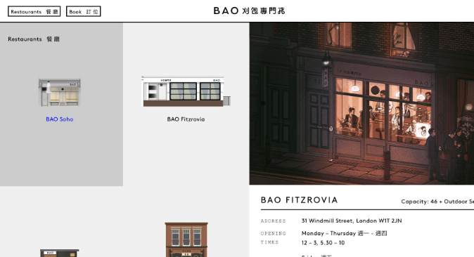 Bao是一家臺灣餐廳,在倫敦設(shè)有三個地點。他們的位置插圖就像縮略圖一樣,不僅暗示著餐廳的外觀,而且還暗示了一種可能的體驗。