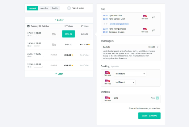 Trainline在旅途時間下方顯示一個欄,以直觀方式指示持續(xù)時間和更改次數(shù)時,從里昂到波爾多的車票預(yù)訂會變得更加簡單