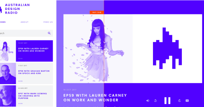 澳大利亞設(shè)計電臺的單調(diào)僅被用于懸停狀態(tài)的對比紅色打破。唯一使用紅色而不交互的元素?具有位置和總長度的播放頭。
