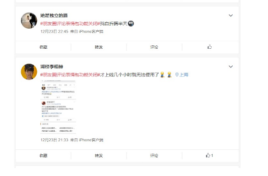 ??微博上已經(jīng)有相關(guān)話題顯示,部分網(wǎng)友稱,朋友圈評論表情包功能關(guān)閉