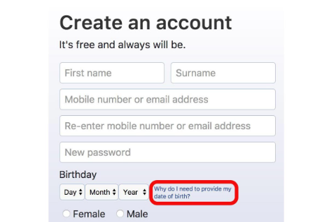 用戶不喜歡提供個人信息,特別是如果他們認(rèn)為不必要的話。向用戶說明您為什么需要他們的信息,或概述您如何使用(和保護)他們的數(shù)據(jù)。例如,F(xiàn)acebook在其注冊框中直接解決了所有用戶關(guān)注的問題。他們的表格說明該服務(wù)是免費的(永久),并且如果您擔(dān)心提供自己的出生日期,也可以解決。