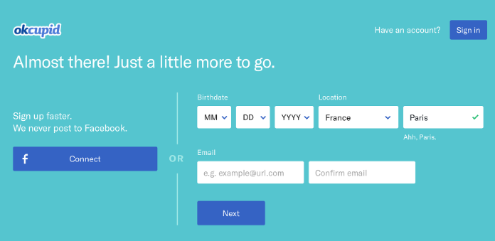 OkCupid在創(chuàng)建新帳戶時會贊美您的城市:“啊,巴黎?!?/i>