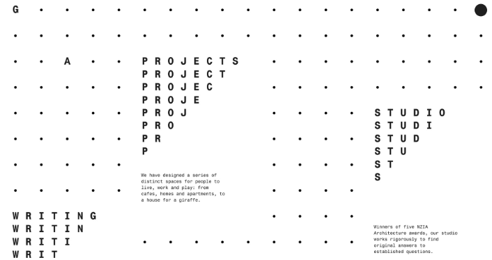 Glamuzina Architects使用整個(gè)主頁作為菜單,其中三個(gè)主要部分的鏈接分布在屏幕上。項(xiàng)目主頁列出了特色項(xiàng)目,包括文本鏈接和大縮略圖。