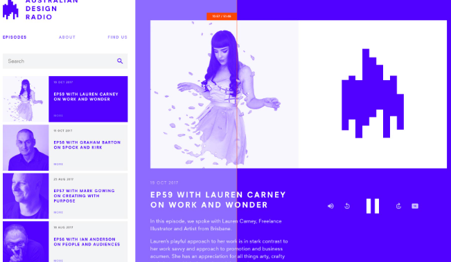 澳大利亞設(shè)計(jì)電臺(tái)的單調(diào)僅被用于懸停狀態(tài)的對(duì)比紅色打破。唯一使用紅色而不交互的元素?具有位置和總長度的播放頭。