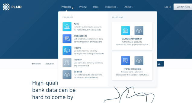 金融交易在技術(shù)上很復(fù)雜。Plaid為開發(fā)人員提供了多種API產(chǎn)品。他們的菜單不僅說明了每種產(chǎn)品的關(guān)鍵功能,而且還根據(jù)產(chǎn)品組合預(yù)覽了兩種潛在的解決方案。