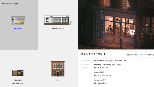 Bao是一家臺(tái)灣餐廳,在倫敦設(shè)有三個(gè)地點(diǎn)。他們的位置插圖就像縮略圖一樣,不僅暗示著餐廳的外觀,而且還暗示了一種可能的體驗(yàn)。
