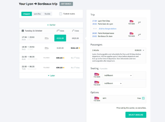 當(dāng)Trainline在旅途時(shí)間下方顯示一個(gè)欄,以直觀方式指示持續(xù)時(shí)間和更改次數(shù)時(shí),從里昂到波爾多的車票預(yù)訂會(huì)變得更加簡單。