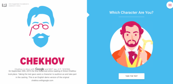 精美的動畫和互動效果鼓勵用戶點擊。請看下面用于“契ov夫活著”網站的設計。該設計要求您單擊以找到您的角色。