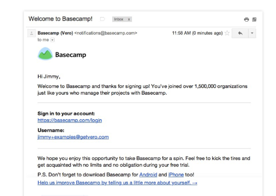 Basecamp的  歡迎電子郵件屏幕截圖