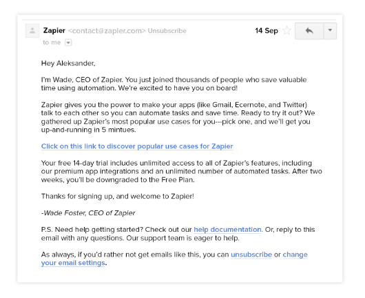 Zapier的  歡迎電子郵件就是一個(gè)很好的例子。這很簡(jiǎn)單; 系統(tǒng)會(huì)告知用戶應(yīng)用程序的功能以及用戶示例的鏈接。明確提到了試用期的條件。明確提到了其他資源,例如幫助文檔。電子郵件以各種各樣的感謝開(kāi)頭,因?yàn)閆apier很高興能邀請(qǐng)用戶加入。Zapier希望用戶采取的下一個(gè)步驟是開(kāi)發(fā)個(gè)人資料,從而使電子郵件具有可操作性。