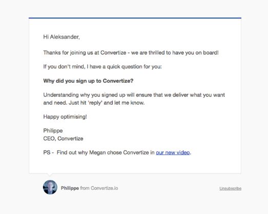 Convertize簽約后,   您將收到首席執(zhí)行官的直接,簡(jiǎn)單的歡迎電子郵件,他將感謝您在第一句話中的簽約。然后,在整個(gè)電子郵件中,存在一些可行的問(wèn)題,提示您直接回覆CEO,并以注冊(cè)的原因作出回應(yīng)。這凸顯了他們對(duì)每個(gè)用戶的贊賞。  因此,轉(zhuǎn)換表示他們關(guān)心您的反饋。最后,他們還向您提供指向其宣傳視頻的鏈接,作為一種資源,它使該平臺(tái)活躍起來(lái),建立了更加人性化的聯(lián)系。從長(zhǎng)遠(yuǎn)來(lái)看,這有助于與產(chǎn)品建立牢固的聯(lián)系。
