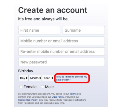 用戶不喜歡提供個(gè)人信息,特別是如果他們認(rèn)為不必要的話。向用戶說明您為什么需要他們的信息,或概述您如何使用(和保護(hù))他們的數(shù)據(jù)。例如,F(xiàn)acebook在其注冊框中直接解決了所有用戶關(guān)注的問題。他們的表格說明該服務(wù)是免費(fèi)的(永久),并且如果您擔(dān)心提供自己的出生日期,也可以解決。