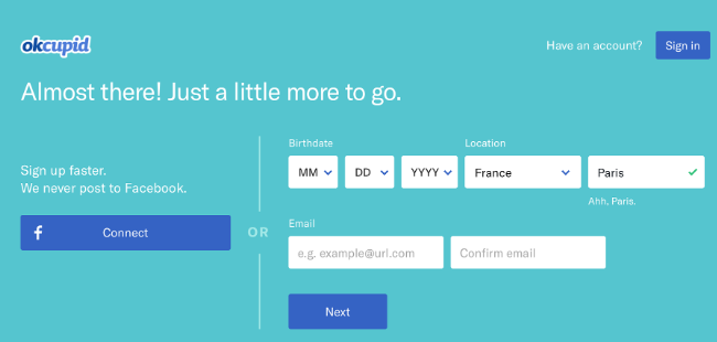 OkCupid在創(chuàng)建新帳戶時(shí)會(huì)贊美您的城市:“啊,巴黎?!?/i>