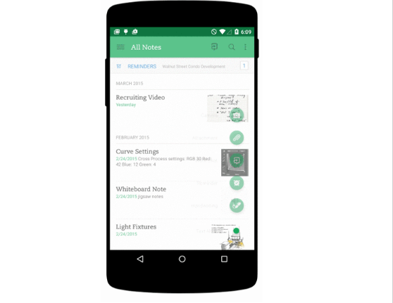 在某些情況下,如下面的Evernote示例所示,使按鈕旋轉(zhuǎn)并公開其他一些選項(xiàng)是合適的。FAB可以將其替換為一系列更具體的操作,并且可以將它們?cè)O(shè)計(jì)為與用戶相關(guān)。根據(jù)經(jīng)驗(yàn),在按下時(shí)至少提供三個(gè)選項(xiàng),但不要超過六個(gè)(包括原始的浮動(dòng)操作按鈕目標(biāo))。