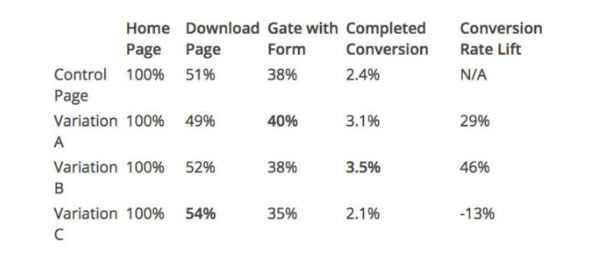 我們看到,首頁的最佳變化形式有所變化,具體取決于您要優(yōu)化的微轉(zhuǎn)換(下載頁面或帶表單的門)。但實(shí)際上,性能最高的首頁(就標(biāo)準(zhǔn)轉(zhuǎn)化率而言)是版本B。