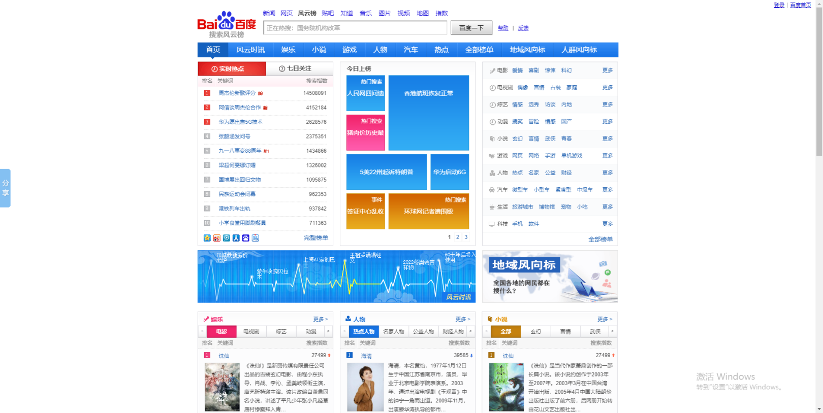 百度搜索風(fēng)云榜是百度以數(shù)億網(wǎng)民的每日搜索行為作為數(shù)據(jù)基礎(chǔ),建立的權(quán)威全面的各類關(guān)鍵詞排行榜,包括了娛樂(lè)、人物、小說(shuō)、熱點(diǎn)、汽車……各個(gè)行業(yè)的熱搜數(shù)據(jù)。