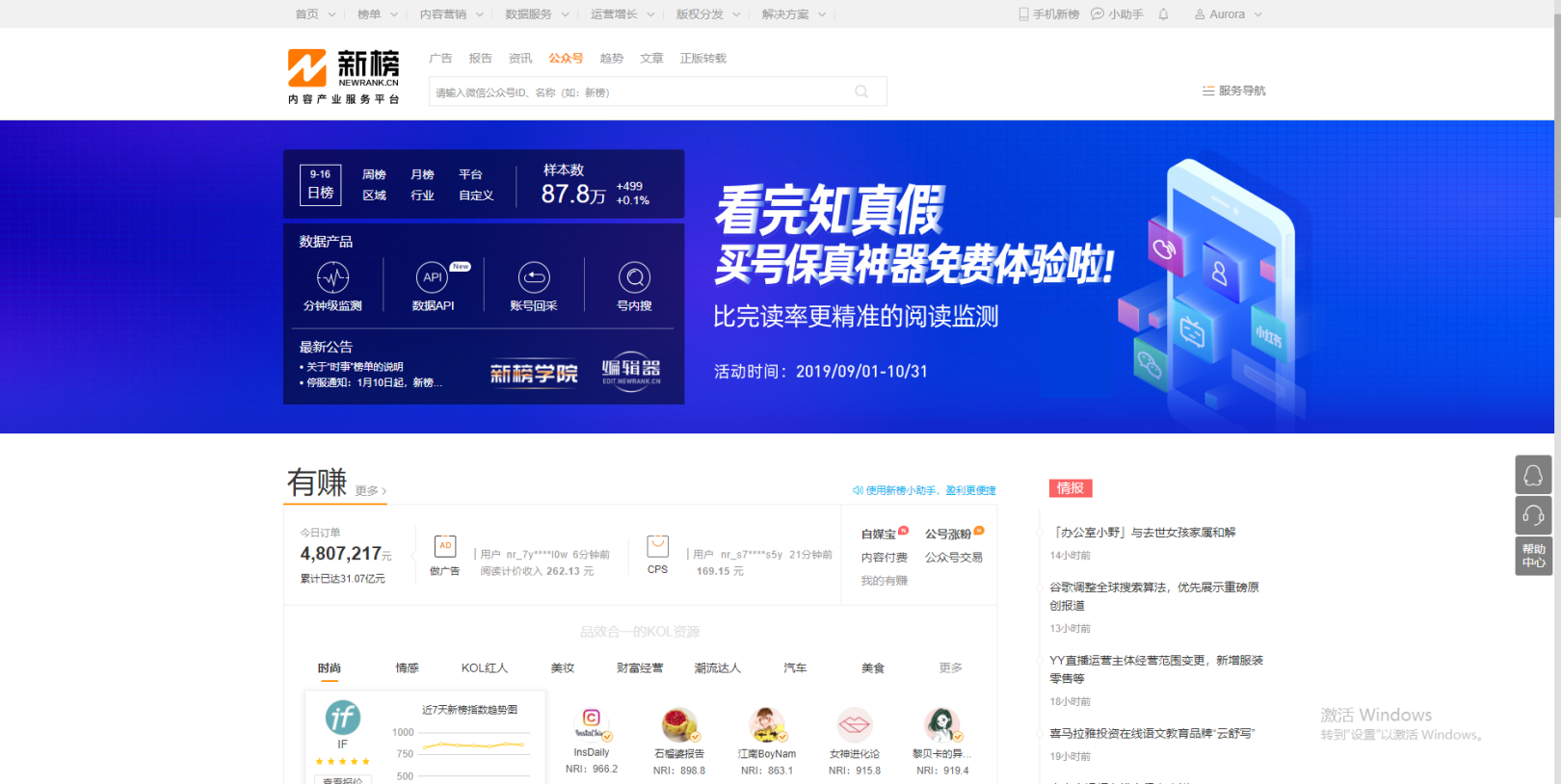新榜指數(shù)相信做微信公眾號(hào)的都知道,提供微信公眾號(hào)內(nèi)容數(shù)據(jù)價(jià)值評(píng)估的第三方機(jī)構(gòu),實(shí)時(shí)發(fā)布微信公眾號(hào)影響力排行榜;想知道那些微信公眾號(hào)、文章最熱門,參考新榜就夠了!當(dāng)然,新榜的功能不僅僅于此,目前新榜還包含了微博、今日頭條……知乎等平臺(tái)的數(shù)據(jù)。
