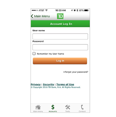 用戶期望移動應(yīng)用程序中的某些交互模式和界面元素。在移動應(yīng)用程序中,我們在Web上設(shè)計(jì)的內(nèi)容通常會感到尷尬-不必要是因?yàn)槌隽它c(diǎn)問題,而是因?yàn)樗c用戶期望看到的完全不同。一個(gè)常見的示例是使用帶有下劃線鏈接的文本,這些鏈接與網(wǎng)頁緊密相關(guān)。以下是TD銀行iOS應(yīng)用程序的登錄表單示例。絕對感覺他們是為移動Web設(shè)計(jì)的,而不是為移動應(yīng)用設(shè)計(jì)的:鏈接帶有下劃線,并且UI中甚至有版權(quán)聲明。