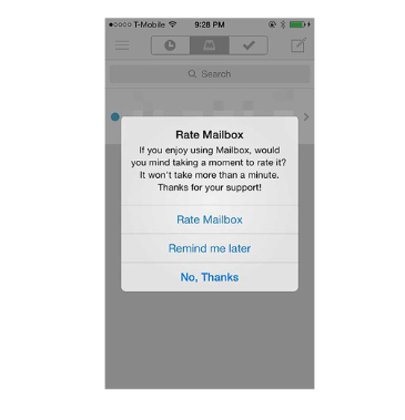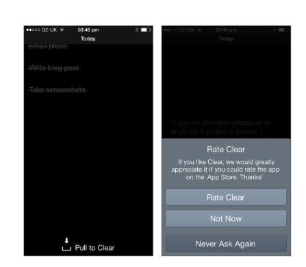 您應(yīng)該避免打擾用戶要求他們對您的應(yīng)用進(jìn)行評分,如果他們是最近才下載或僅使用過幾次。要求進(jìn)行審核沒有錯(cuò),但是請記住,您首先要給用戶帶來良好的體驗(yàn)。等到證明他們是重復(fù)用戶,再在您的應(yīng)用程序中找到干擾最小的時(shí)刻。顯然,iOS上的待辦應(yīng)用程序就是一個(gè)很好的例子:用戶清除列表中的剩余任務(wù)后,它會顯示“ Rate the app”對話框。這是應(yīng)用程序中的重要時(shí)刻:用戶對剛剛清除待辦事項(xiàng)列表感到滿意,并且更有可能對應(yīng)用程序進(jìn)行評分。