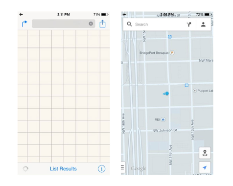 以下是Apple Maps(左)和Google Maps(右)如何使用其緩存的示例。Google Maps會記住最后一個(gè)位置,并且在緩存中保存了大量的地圖詳細(xì)信息,而Apple Maps則什么也沒有顯示。關(guān)于Apple Map的離線體驗(yàn),沒什么好說的。