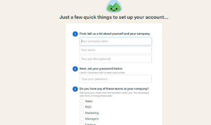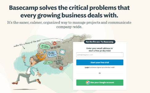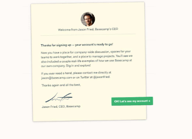 項(xiàng)目管理軟件Basecamp擁有非常出色的入職體驗(yàn),可以使他們加入愉快的體驗(yàn)。帳戶創(chuàng)建頁面的這種家庭式設(shè)計(jì)風(fēng)格使新用戶放心,因?yàn)樗麄儞?dān)心這是一個(gè)龐大而昂貴的企業(yè)軟件。最重要的是,首席執(zhí)行官親自打招呼。Basecamp的價(jià)值主張(VP)是它促進(jìn)團(tuán)隊(duì)協(xié)作:讓老板在您上車時(shí)打招呼,以重申該VP。