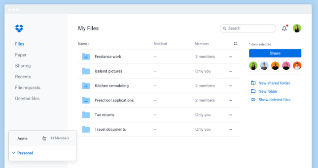 Dropbox的檢修提供了更清晰的帳戶分離,使用戶可以更輕松地區(qū)分其工作帳戶和個人帳戶。最大的區(qū)別之一是用戶將只看到其登錄帳戶的特定搜索和通知。