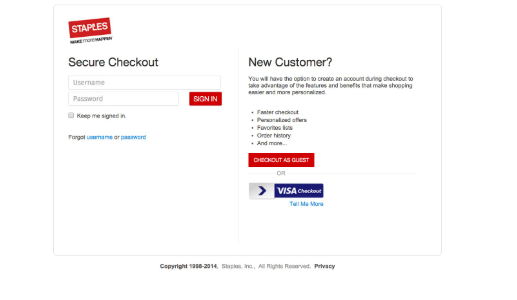 斯臺普斯對此非常了解。辦公用品和電子產(chǎn)品零售商具有初始結(jié)帳頁面,該頁面不會強(qiáng)迫購物者再次注冊或強(qiáng)制新購物者注冊。相反,如果他們要返回購物者,則可以輕松地在兩個字段中輸入用戶名和密碼,或者直接進(jìn)入“以旅客結(jié)帳”頁面,如果他們是,則只需輸入基本的送貨信息新客戶。這樣的設(shè)置使客戶的事情變得更簡單,并為他們提供了更大的自由度和對結(jié)帳流程的控制權(quán),這始終受到歡迎。