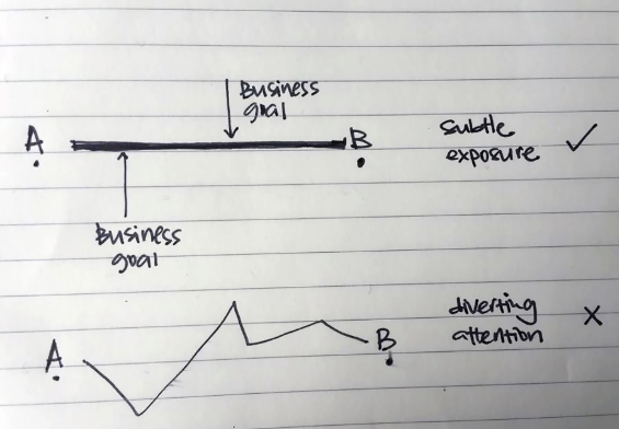 架構(gòu)師通常不會故意將用戶分散到實現(xiàn)這些業(yè)務(wù)目標的過程中,而是會進行刻意和微妙的曝光,并在此過程中注入一些細節(jié)。這可以通過開放走廊的形式來完成,以瞥見另一條路線,巧妙地放置標牌等。在UX設(shè)計中,還應(yīng)考慮要滿足業(yè)務(wù)目標的要素。它們可能是新用戶注冊,廣告和產(chǎn)品展示位置以增加獲利的目標,等等。
