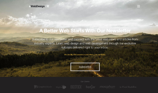 eWebDesign理解這一點,并據(jù)此設(shè)計了它的站點。請注意,首頁右上方的隱藏菜單非常謹(jǐn)慎。它甚至沒有粘性,因此向下滾動將使其消失。隱藏菜單的這種不顯眼的存在意味著訪問者的注意力會立即吸引到該站點的獨特價值主張,即其博客的訂閱者直接從行業(yè)專家那里接收網(wǎng)絡(luò)新聞。這也無縫地定位在提議下方的“訂閱”號召性用語按鈕。