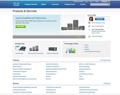 龐大的網(wǎng)絡(luò)設(shè)備設(shè)計(jì)師和制造商思科的導(dǎo)航欄完美地展示了可視性。無論用戶訪問哪個(gè)網(wǎng)站頁面,他都將始終能夠輕松找到通往另一部分的方式,因?yàn)閷?dǎo)航欄始終存在并引起人們的注意。這為用戶創(chuàng)造了信心和秩序感。